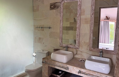 Traditional Balinese inspired architecture, this place is a 3 ensuite bedrooms and 2 guest houses with spacious outdoor area and cozy seating spots, ideal for hosting family and friends gatherings. Unique experience to immerse themselves in the local lifestyle, enjoying sunset walks to the beach and dining at the best restaurants in Pererenan. The location is excepcional and the domestic help makes it easy to stay in a house of considerable size. It has the best gyms, yoga centers, excellent spas and padel clubs from all Bali nearby. There is also a massage area in the villa with option of home massages and optional bikes aswell to rent. The main attraction is the covered dining area and chillout where you can hold meetings, have a BBQ, gather a workshop or simply take a nap, read or have a drink surrounded by water lilies, birdsong, the river and the ocean sound overlooking a lush manicurated garden.