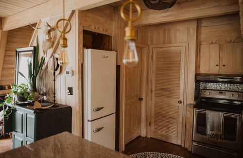Downstairs bedroom has vintage shutters and a king sized sleep number bed, down alt. cloud comforter and cotton sheets. Full bathroom with charming blue vintage tiles. Towels and bathrobes provided. Modern renovated kitchen including oven, disposal, toaster oven, coffee maker, dishwasher, microwave and a fun new vintage style fridge. Stocked with anything you’d need to host. Cabinet space for pantry items. Stone counter with peninsula seating. Dining space features local photography over the large wooden dining table that seats 8+. Living space centers a black leather couch and floor cushions by the gas fire. Turn on a record, play a game together, curl up and watch a movie. Velvet chair window lounge/plant solarium for bird and weather watching. Upstairs to the right holds the largest bedroom with 2 queens, reading nook with vintage lamp, smart tv, and vanity space. Upstairs to the left is a 3:4 bath with a tiled shower. Continuing to the left is a small charming lofted twin bedroom. 2 twin beds, dvd/tv sit beneath a string lit lofted sitting area. Loft is off limits for guests. Outside on the deck held up by massive boulders, enjoy the beautiful surroundings and the Webster grill connected to the gas line. Outdoor firebowl off limits for guests per Hound Ears, please lounge and cheers in the Adirondack chairs under the forest canopy none the less.