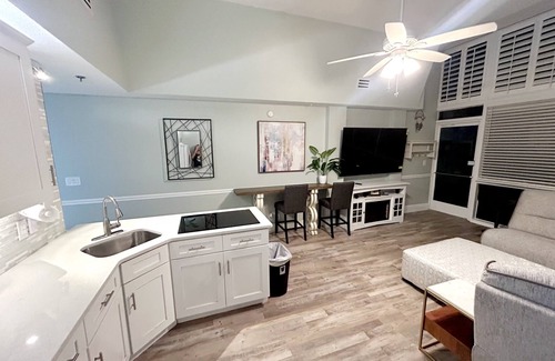 This fantastic condo in Daytona Beach offers a cozy retreat for guests. Located on the ground floor it has its own private door straight to beach and pool. With 1 bedroom featuring 2 comfortable queen beds, Roku tv, plentyof storage space. Living has floor to ceiling windows looking out over the Atlantic Ocean. Lovong room has new sectional, fireplace, Roku TV and dining bar stools facing the beach. The kitchen is full sized with cooktop, refrigerator, microwave, toaster, coffee maker and all necessarycookware. This quaint space is perfect for a relaxing getaway. Enjoy amenities like heating, AC, WiFi, POOL AND TIKI BAR, covered parking and a fitness room during your stay. Our place is equipped for both long or short stays to make your holiday one to remember.