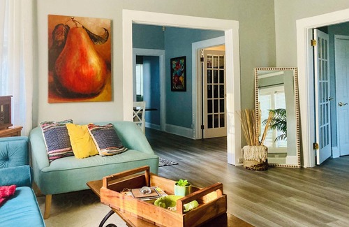 Welcome! This lovely two bed two bath home has all the essentials for comfortable living! Enjoy the ample parking, eat-in kitchen, dedicated office, dining, family and laundry rooms, which make the stay perfect for both quiet retreating or cozy gathering. Eclectic styling, attention to detail, and unique artwork bring warmth and interest to each space. Amenities include free WiFi, smart TV, keyless entry, central AC and heat. The primary bedroom has a queen bed and attached full bath. The secondary bedroom has a full bed and direct access to the full hall bath.