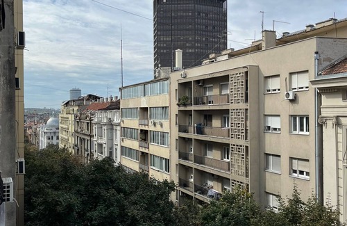 lovely view of Resavska Street, St. Mark’s Church, and the impressive Beograđanka tower, as