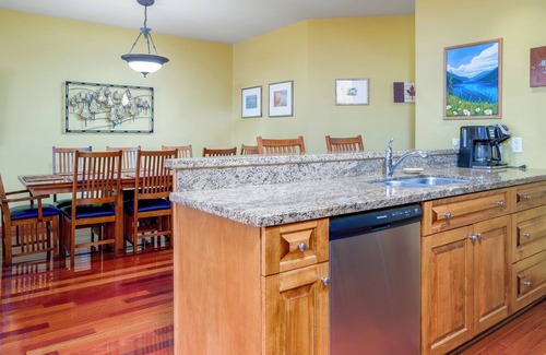 The master bedroom has a king bed and ensuite bathroom with a large shower. The second bedroom has one queen bed and single over single bunk bed with access to the back patio and hot tub. The second bathroom has a tub and the laundry facilities. The dining and kitchen area features beautiful hard wood flooring throughout. A large wood table with 8 chairs and a breakfast bar with 3 bar stools, allows for ample seating. The kitchen has granite counter tops, stainless steel appliances, loads of cupboard/drawer space and is well stocked with anything you could possibly need.