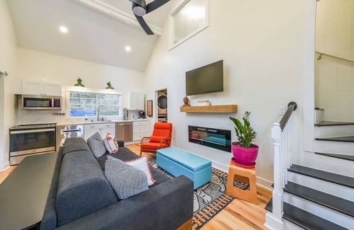 This thoughtfully designed cottage blends modern amenities with the warmth of a welcoming home. The open layout allows for ample natural light to fill the living spaces, creating a bright and airy ambiance. The living room features cozy seating, a flat-screen TV, and a faux fireplace, making it the perfect spot to unwind after a day of exploration. Air conditioning and high-speed WiFi ensure your comfort and connectivity throughout your stay.