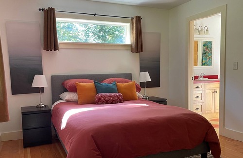 Upstairs is a large loft for relaxing, with two single mattresses, a smart tv, games and books. The upstairs bedroom has a new Casper memory foam mattress, black out blinds, and a spacious work area. The upper floor has a full height ceiling in the center that tapers down to create a cozy atmosphere. Local artwork and vintage touches throughout the cottage reflect decades of collecting by one of your hosts, including a full set of colourful Fiesta dishes and vintage wool blankets and throws.