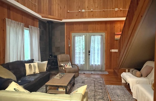 This cozy cottage walking distance from the Black River invites you to come swim, fish, or bring your kayak. Later you can hang out on the patio, soak in the claw foot tub, or build a warm fire in the wood stove. Enjoy nature just 20 minutes from White Lake. The downstairs bedroom has a full bed. In the upstairs loft there is a King size bed on one side which is open to the other side where there are two twin beds. There is chair under the stairs in the living room that pulls out to make a twin sized bed. This is a relatively secluded location in a private neighborhood intended for getting back to nature.
