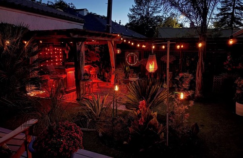 In addition, we have a separate studio/media room behind the main house with a flat screen tv, and two relax the back recliners for your comfort. There are huge french doors that open to the garden from this studio/media room. If you are working remotely, we have a lovely desk in the studio/media room that faces that garden.