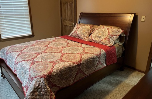 Both bedrooms feature queen beds. There is an inflatable twin mattress that can be used as an additional bed in either the primary bedroom or the living room. We can accommodate parking for a vehicle with a small boat trailer, travel trailer, or RV (no connections available).