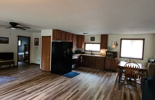 Welcome to this newly remodeled interior house in Manistique. This wonderful property features 2 cozy bedrooms - one with a queen bed, the other with a queen and bunk bed. The bathroom is equipped with a shower and a hair dryer for your convenience. Additionally, there is a lovely living room with an extra pack and play for infants and a comfortable sofa for added comfort. Lakes are nearby for fishing and we are under a mile from the Haywire Grade ORV Trail and two miles away from the Hanley Truck Trail. For the days when you are trapped inside we offer a 65" TV in the living room that you can use for your streaming services or watch the free channels offered. Throughout the home you will have WiFi speeds of 500mb, the fastest speed in the area, for all of your internet browsing and streaming needs. For those who prefer a less digital entertainment experience we also provide multiple board games. The kitchen has a refrigerator, gas stove, utensils, microwave, table and chairs, and for those that want to grill there is a grill outside. Our place will help you feel at home while you're traveling in Manistique