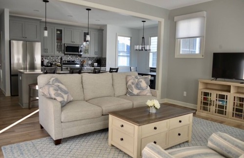 From the moment you arrive, you’ll be welcomed by a classic front porch with a cozy swing, along with a charming enclosed side porch—perfect for leisurely mornings with coffee or quiet evenings in conversation. Step inside to an open-concept layout flooded with natural light and accented by refined finishes. The first-floor primary suite offers a king-sized bed and a private ensuite bath, providing a peaceful retreat. A spacious gourmet kitchen anchors the main living area, featuring an oversized island with seating for four, a dining table for six, and both a drip coffee maker and Keurig with a selection of coffees. Essentials such as paper goods, dish soap, and laundry detergent are provided for your convenience. The main level also includes a half bath and laundry room.