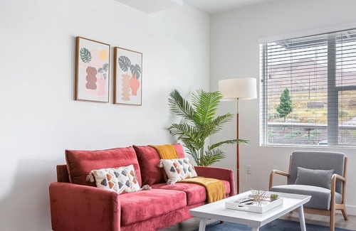 Tucked in a charming residential neighborhood, this two-bedroom apartment sits in the heart of Salt Lake City’s Bluffdale community. The apartment is just a short drive from attractions like Thanksgiving Point (where you’ll want to go for shopping and dining), the Museum of Natural Curiosity at Thanksgiving Point, Saratoga Hot Springs, and Storm Mountain Park. Inside the home, you’ll enjoy bright, natural light, a living area with stylish furniture, pops of color, and a designated workspace, and a main bedroom with an en-suite bathroom and closet. There’s a cute outdoor balcony and you’ll find a pool, gym, and additional outdoor entertainment space in the apartment building.
