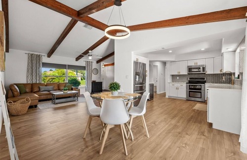 Welcome to Your Poolside Oasis! This bright and modern 2-bedroom, 2-bathroom home features an open-concept living space with vaulted ceilings and stylish wood beams. Relax in the living area,cook in the fully equipped kitchen, or enjoy meals in the dining nook. The primary suite boasts a cozy retreat with plenty of natural light. Step outside to your private screened-in pool and lounge area – perfect for soaking up the sun or unwinding. Located in a quiet neighborhood close to local attractions!