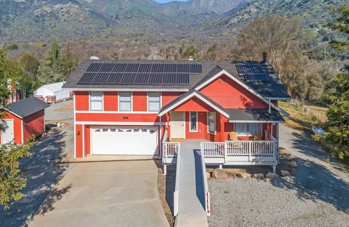 Enjoy panoramic views of the Sierras from the sweeping grounds of this 2 acre estate. New to the vacation rental market, this resort-style property will delight guests with amenities such as a private pool, direct river access, and a fitness course. Located about 3 miles from the entrance to Sequoia National Park, the Redwood Retreat is the perfect escape after long days exploring the magnificent Giant Sequoias.