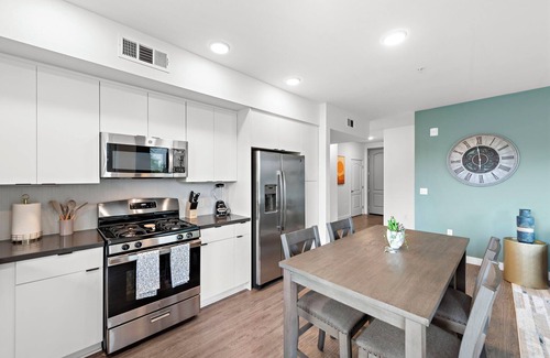 Enter a spacious retreat where modern amenities meet cozy living. The apartment features three beautifully appointed bedrooms, each designed with your comfort in mind. Plush bedding ensures a restful night's sleep, while ample closet space provides convenience. Relax in the inviting living room, tastefully furnished with a large sectional sofa and a flat-screen TV, ideal for unwinding after a day of exploring Orange County
