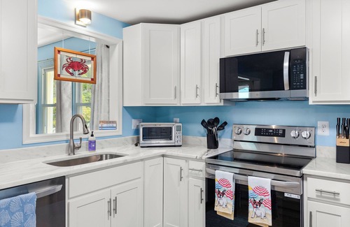 Come enjoy all that the Maryland Eastern Shore has to offer at CrabbyPines in Ocean Pines. You may never leave this amenity-packed neighborhood with numerous parks, 5 pools (one of which is an indoor open year round), a yacht club, Bay access, Ocean City Beach access, golf course, raquet sports, and restaurants for all times of the day and night. Streets are great for biking, walking, and rollerblading. Do make time for the ocean which is only 8.5 miles away via MD 90 for north access and 50 for south access. Ocean City has everything for family fun! Bright, beachy, newly renovated 3 BR, 2 full bath, 1 story house on a large, quiet corner lot with 4 car + paved driveway. The living room and dining room have vaulted ceilings. Fabulous, all new kitchen. King Master BR with ensuite full bathroom. A second BR has a queen bed and the third BR has 2 twin beds, one of which has a trundle. There are 2 sleep sofas, one in the living room and one in the den. Linens and towels are provided. The second full bathroom is off the central hallway. Extra den space leading out to the patio provides additional living space. Smart TVs in all bedrooms, living room and den. Outdoor accessories include bicycles, boogie boards, hammocks. Beach chairs and beach towels are available. Enjoy crabs on the picnic table outside or relax around the gas firepit or sit on the deck under the umbrella. Play cornhole, ride bikes, relax in hammocks. Games, puzzles, and books are available.