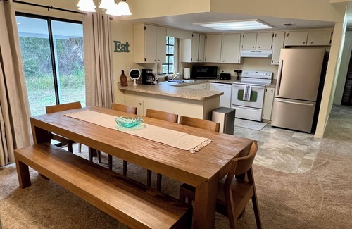 Nestled in a serene cul-de-sac neighborhood, this cozy house is approximately 2 miles from Three Sisters Springs and minutes from downtown Crystal River for plenty of shopping and dining options during your stay. We offer plenty of room for multiple vehicles and boats with trailers. This home has never flooded, not even during the recent historic Hurricane Helene, so you can stay here worry free.