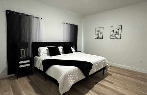 Equipped with a fully functional kitchen, laundry room, high ceilings, wood and tile floors, and stylish/relaxing furniture makes this space feel like your home away from home.