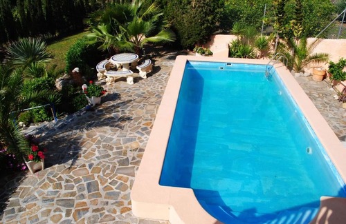 3 bathrooms (1 of them ensuite of main bedroom), 2 kitchens - main kitchen well equipped: main kitchen: large fridge with freezer, dishwasher, ceran cooker, elecrtic oven, toaster, kettle... second kitchen in the basement; large terrace with panoramic views, garden area, private swimming pool. Parking beside the house. WiFi. Distance to the beach ca. 1.6Km