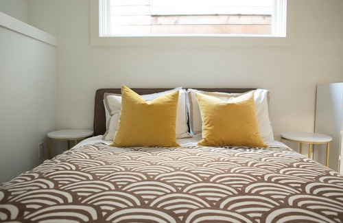 Our newly constructed Richmond Charmer offers a gleaming space in a quiet yet convenient neighborhood. Step in through the bright orange front door to this brand new, modern design, garden apartment in the safe and clean Richmond District. Complete with radiant floor heat, a full step-in shower with Italian tile, washer-dryer, dishwasher, and sleek modern furnishings this tranquil spot offers indoor and outdoor dining for guests. The two generous bedrooms provide comfortable space for friends or colleagues traveling together or for a small family. They both are fully furnished and include full closets.