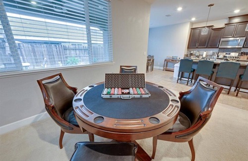 Our living room and play area feature two sofas, two swivel chairs, a poker table, and a kids corner. The open floor-plan makes it perfect for entertaining.