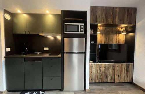 PLAGNE 1800 – RESIDENCE EPERVIERE. Completely renovated 2-room apartment with lots of charm featuring a south-facing balcony with a view of the mountains. The residence is part of a complex of 7 chalet buildings and is located in the heart of Plagne 1800. The apartment offers a warm and contemporary decoration.