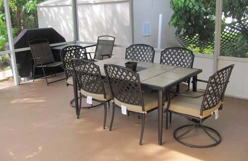 Villa features screened pool, private patio seating, and barbecue grill. The pool and BBQ grill are shared with the other unit, although each unit has its own patio seating area and garden space to enjoy plenty of outdoor space.