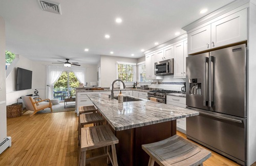 Charming coastal-chic colonial home in the heart of Mystic, situated in the coveted West Bank Historic District. A quiet road just moments from restaurants and shops, this home away from home affords you an expansive half acre of tranquility with immediate access to all that Mystic has to offer. Enjoy a drink on the deck overlooking the town and peek-a-boo views of Mystic harbor, make the yard your playground, or walk/cycle/drive in minutes to many activities. The house has a fully equipped kitchen where you can enjoy meals with your family and friends. On the second floor you will find 3 bedrooms. The Master bedroom has a queen bed and it's En suite bathroom which has been fully renovated. The other two bedrooms also have queen beds and an additional "chairfuton" size twin for a young child to sleep on if need to. Those 2 bedrooms will share the second bathroom, which also has been fully renovated. You will have access to Gigabit speed internet which will allow you to work and watch your favorite shows on the smart tv's in the Den or in the Family room. Your teenagers will enjoy spending time in the nautical themed unfinished basement, with 2 sets of bunkbeds, a foosball table and a TV for their enjoyment and a full bathroom with shower.