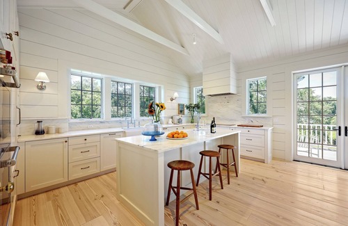 On the first floor, you're welcomed into a bright, shiplap-lined living room with warm wood floors and abundant natural light. Comfortable seating surrounds a woven coffee table, and a built-in wet bar makes entertaining a breeze.