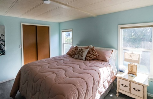 Escape to the southern Oregon coast and experience a memorable stay at this charming cottage near the water. Designed with bright accents, this home features a single-story layout with a well-equipped kitchen and two cozy bedrooms, one of which has a writing desk -- ideal for remote work or online school. Peruse a collection of board games and gather around the living room coffee table for family game night. Added perks include upgraded flooring throughout and a convenient laundry room. Kick back and relax on the covered front porch, furnished with seating for two.