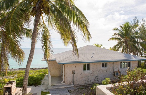 "Gurgle and Whump" - named for the two blowholes or "boiling holes" in the rock beside the sea - is a charming, airy two-bedroom house right on the shore of the Caribbean side of Eleuthera. Light, bright furniture and several large glass sliding doors give you the feeling of being out in the sea and sky even indoors. The sliding doors of one bedroom look straight out to the sea, the sliding doors of the other look out to the sea through the garden's palm trees. Both bedrooms have AC. The great room does not.