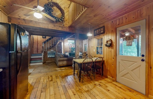 The interior of this wonderful mountain cabin is just as appealing, offering a blend of rustic, knotty pine features with updated amenities and appliances. The main floor features a well-equipped, eat-in kitchen with plenty of counter space and all the gadgets and gear you need to prepare quick snacks or elaborate feasts. When it’s time to eat, there’s a dining table for four - perfect for laptops or rainy day games. Or head outside, fire up your gas grill, and dine al fresco at the picnic table set right beside a wood-burning fireplace. The main living area is ideal for quiet nights in. Just switch on the gas fireplace and cozy up together on the comfortable queen sofa bed.