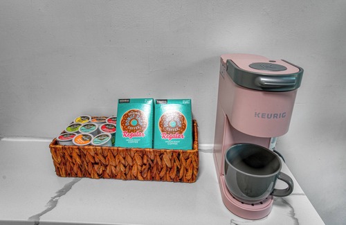 The modern kitchen is fully equipped with all new stainless steel appliances, a coffee station (including a Keurig & coffee pods), pots & pans, baking sheets and more.