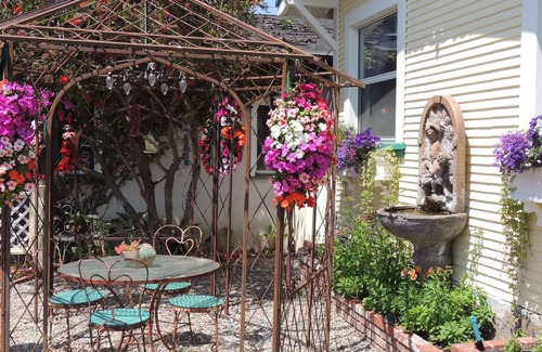 An oasis In the heart of Old Town with beautiful gardens, fountains and birds. Loaded with charm and flooded with light! Built in the 20's, this home has been carefully restored and updated without sacrificing the special esthetic of the period. From the original clear Douglas fir floors, antique light fixtures, wide floor and window moldings to the vintage gas pot bellied stove (fireplace), the large bathroom with soaking tub and pedestal sink. The master bedroom has a queen bed with a black iron headboard, antique oak highboy dresser and vintage chandelier. The second bedroom also features a queen bed with a period headboard and additional vintage touches. The kitchen is sunny and bright with hand painted tiles and windows that look out onto the garden fountain and bird feeders.
