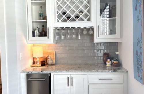 The kitchen seamlessly blends with the main living space, ensuring that the chef is always part of the gathering. It boasts granite countertops, stainless steel appliances, a generous island, ample custom-built cabinets, and a convenient dry bar with a separate icemaker.