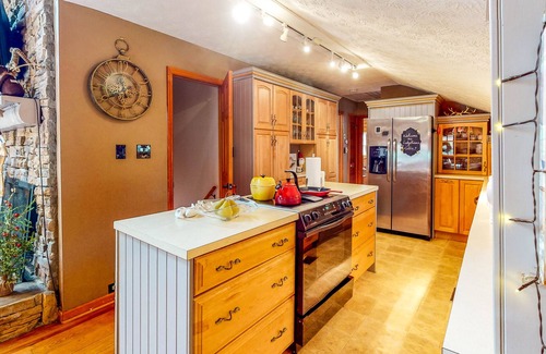 Vaulted ceilings, rich wood floors, and exposed beams create a lodge-like vibe, while skylights flood the space with natural light. This charming retreat is also decorated for each holiday season, adding festive flair.