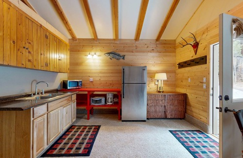 Inside, the well-equipped, full kitchen boasts stainless steel appliances, a breakfast bar, and counter seating, while the cottage features a convenient kitchenette with a fridge, microwave, and coffee maker. After a day of outdoor adventures, unwind in your private hot tub or gather around the fire table for a cozy evening under the stars.