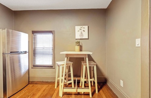 This bright and spacious apartment sits above Fric & Frac, one of Kansas City’s beloved local restaurants, and is part of a charming building with just four other apartments. Perfect for extended stays, the space features huge windows with views of the lively street below, bringing in tons of natural light. You'll find a sunny entryway with seating and a rollaway bed, a spacious living room, and a fully equipped kitchen stocked with everything you need—including cookware, utensils, and more.
