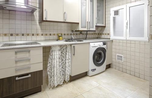 It has a magnificent living room with two sofas and a TV and a work area. Fully equipped kitchen with all kinds of appliances: fridge, freezer, ceramic hob, oven, microwave, washing machine, kettle, blender, toaster, pots, pans, plates, crockery...