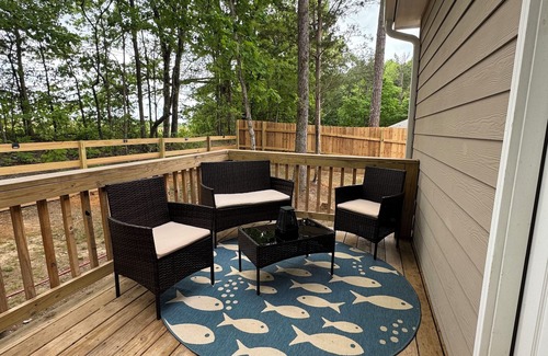 Outside, relax on this 1 acre! Inside the privacy fence there is a back deck with seating for 4 or next to the firepit with adirondack seating for 4. The front porch has 2 rocking chairs if you'd like to just rock the day away.