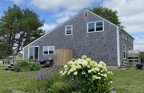 Charming New England shingled styled 3 bedroom 2 bathroom home with a garage field house on 3+ acres of land. The garage field house has an additional bedroom, bathroom and full kitchen and outdoor shower. Both houses have open floor plans and have been nicely decorated with new furnishings. Window A/C units in all 4 bedrooms during summer. Spectacular sunsets can be watched over dinner off the back deck with table & chairs.
