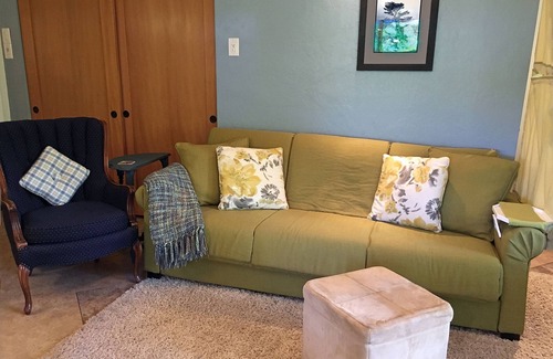 • The Country Guest House includes free WI-Fi and parking, a flat-screen satellite TV, movies and DVD player, a sofa, a dining table and chairs, a 14’ closet, a Queen size bed, etc. It sleeps 1 or 2 people. The 440 square foot guest house includes a private bathroom and a fully stocked kitchen. Just outside the French door, guests enjoy a quiet and private patio with a bistro table and chairs overlooking the garden, a private picnic table, an outdoor sofa, and a hammock along with all of the amenities of the property.