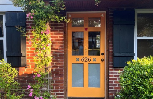 The mid-century home is located on a corner lot surround by shady oaks and a range of well-kept flowering plants and bushes. You park in a curved oyster shell driveway. The yellow front door is framed by a beautiful pink Peggy Martin rose vine made famous for surviving Hurricane Katrina. The fenced back garden has a hand-painted picnic table with seating for you and friends. There is a cedar screened-in porch to enjoy mosquito free relaxation in the cooler evening hours.