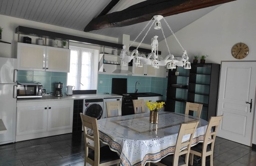 Renovated old house, located on a working farm (organic cereals), adjoining another gîte, close to the owner's home and a 3rd gîte. Ground floor: living room/kitchen, lounge, shower room, toilet, small bedroom (1 double bed). Upstairs: 3 bedrooms (1 double bed) (1 double bed and cot) (2 separate beds 100x200), shower room/toilet. High chair on request. Wi-Fi. Private landscaped grounds of 350 m², terrace (relaxation lounge, garden furniture, barbecue). Swing, trampoline. Fishing in a private lake 500 m away. Options: