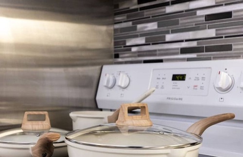 - Fully stocked kitchen with coffee machine, olive oil, pots, pans, and more