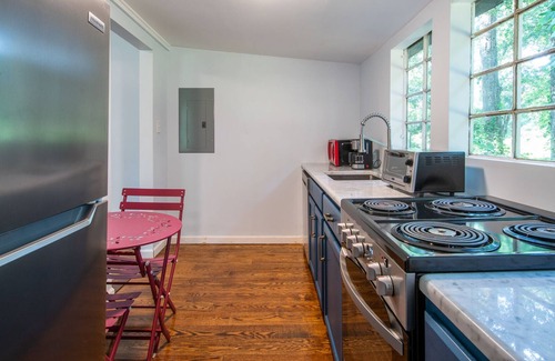 This charming cottage is located on 2.5-acre wooded lot with a creek running through it close to historic Downtown Charleston. It offers ample free parking, fully equipped kitchen with Carrara marble countertops, red oak floors, full bathroom, washer/dryer. Large yard has a wood burning grill, outdoor table, firepit with Adirondack chairs, hammock. Bring your kayak/canoe - public boat landing on the gorgeous Ashley River is just two blocks away. There is a larger house on property in which owners reside.