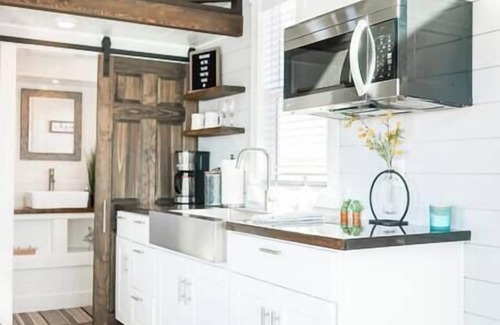 The Great Escape Tiny Home is a stylish retreat featuring a queen bed, sofa bed, skylights for stargazing, and a bar-style dining area. Inside, enjoy a full kitchen with fridge, microwave, cooktop, sink, coffee maker, and essentials, plus a bathroom with a shower. The living room offers a smart TV, AC, heating, and Wi-Fi. Outside, relax on the private deck with seating, BBQ, fire pit, and beautiful views. Free parking, EV charging, and playground access are also included.