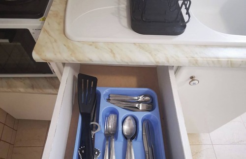 The fully equipped kitchen has everything you need to prepare meals at home, including stovetops, an oven, a refrigerator, a coffee maker, and all essential cookware and dining utensils. Enjoy your meals at the dining table, or step out onto the private balcony, where you can relax with a cup of coffee or a glass of wine while taking in the peaceful village views. The small balcony is furnished with a table and chairs, providing a perfect outdoor space to enjoy the serene surroundings.