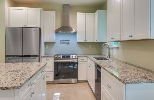 OUTDOOR LIVING: Private patio, seating, private yardINDOOR LIVING: Smart TV, en-suite bathroom, dual-sink bathroom vanityKITCHEN: Stainless steel appliances (stove/oven, fridge, microwave, dishwasher), coffee maker, cooking basics, dishware & flatware, blenderGENERAL: Keyless entry, complimentary toiletries, free WiFi, central A/C, hair dryer, iron/board, trash bags & paper towels, linens & towelsFAQ: 1 half step to enter, 2 exterior security cameras (facing front entryway & driveway)PARKING: Garage (2 vehicles), driveway (2 vehicles), free street parking (first-come, first-served)