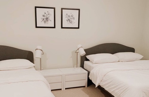 Enjoy a stylish experience at this centrally located home only a 2 min drive to the water or a 5 min bike. Everything is nearby with this location! Stunning back yard with lots of room for activities with the kids or some good ol' drinking games! House is beautifully furnished with two King beds on the main floor and three queen beds in the basement. Stylish dining area opening to the main living area up with a comfy sectional in the movie room to shove the kids downstairs. There's also air hockey, foosball, and kids toys in the basement, a kids electric side-by-side to use, and a treadmill in the garage. Hope you enjoy! :)