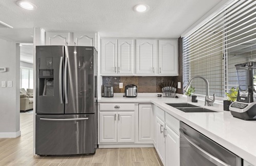 Please note: The house features a single step in the master bathroom and a single step down near the front entry in the additional living room. We've taken measures to ensure guests are aware of these steps by installing "Watch Your Step" signs. Additionally, for security purposes, there are ring cameras installed at the front, side, and backyard pool area of the house.