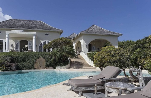 As you take in the view from the terrace, the clear water of the swimming pool competes for your attention with the turquoise of the sea beyond. Above, paille-en-queue birds chase one another across the sky. Below, sea turtles coming up for air make ripples in the placid waters of Marigot Bay. A sandy path beside the pool beckons you to grab one of the weathered walking sticks under the archway and explore the acres of land between the villa and the ocean.